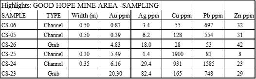 The Company is also pleased to report on a new surface discovery in a historic area known as the Good Hope #2 Mine, on the Evening Star property. Recent assay results indicate a significant zone of gold and silver mineralization hosted in fractured and sheared granodiorite. Gold values up to 20.30 grams per tone (g/t Au), silver values up to 82.4 g/t Ag and copper peaks of 0.19 per cent Cu were returned from surface samples over a strike length of approximately 500 meters trending NNW (North-North-West) from the northern location of the Gold Bug target. Lead is strongly anomalous in this target. Although numerous dozer trenches and pits, and a few shallow shafts are noted in the target area, there is no evidence or knowledge of any drilling. The company cautions investors that the Good Hope sampling is preliminary in nature and that grab samples are selected samples and are not necessarily representative of the mineralization on the property.
